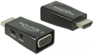 Mit diesem Adapter von Delock kann z. B. ein VGA Monitor an eine freie HDMI Schnittstelle des Systems angeschlossen werden. Des Weiteren besteht die Möglichkeit über die Klinkenbuchse das Tonsignal zu übertragen.