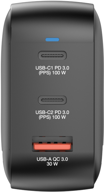 1x USB-A Buchse (30W), 2x USB-C Buchse (100W), maximal 100W gesamt, Qualcomm Quick Charge 3.0, USB-PD 3.0, PPS, GaN, inklusive Reiseadapter