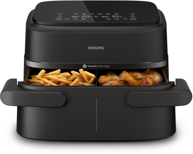 Zwei einzelne Garkörbe für die Zubereitung von zwei Gerichten zur gleichen Zeit oder ein XXL-Korb für eine extragroße Portion Pommes? Mit dem kompakten Philips Airfryer Flexible Basket und der herausnehmbaren Trennwand ist beides möglich.