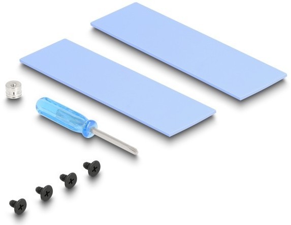 Dieser Kühlkörper von Delock dient der Wärmeableitung einer M.2 SSD. Er wird einfach um die SSD herum montiert, über die Wärmeleitpads erfolgt die Ableitung der Hitze von der SSD zum Kühlkörper.