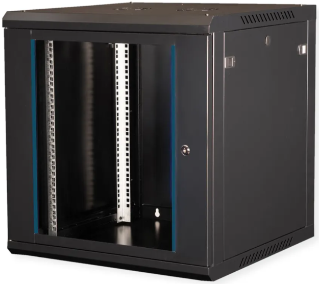 Die VALUE Wandgehäuse sind für flexible Netzwerkverkabelungen konzipiert und verfügen über ausgestanzte Kabeleinlässe im Boden und Dach sowie eine Lüftervorbereitung. Die robuste Stahlkonstruktion ist pulverbeschichtet und mit abnehmbaren Seitenwänden samt Schnellverschluss ausgestattet. Für mehr Sicherheit lassen sich optionale Schlösser integrieren. Der Schrank wird als Bausatz geliefert und lässt sich schnell und einfach montieren.