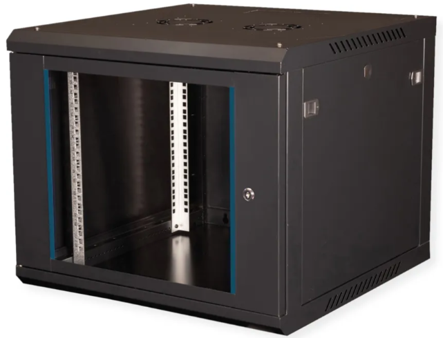 Die VALUE Wandgehäuse sind für flexible Netzwerkverkabelungen konzipiert und verfügen über ausgestanzte Kabeleinlässe im Boden und Dach sowie eine Lüftervorbereitung. Die robuste Stahlkonstruktion ist pulverbeschichtet und mit abnehmbaren Seitenwänden samt Schnellverschluss ausgestattet. Für mehr Sicherheit lassen sich optionale Schlösser integrieren. Der Schrank wird als Bausatz geliefert und lässt sich schnell und einfach montieren.