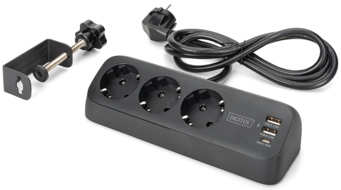 DIGITUS 3-fach Office-Steckdosenleiste mit 2x USB-A und 1x USB-C Anschlüssen, Schwarz