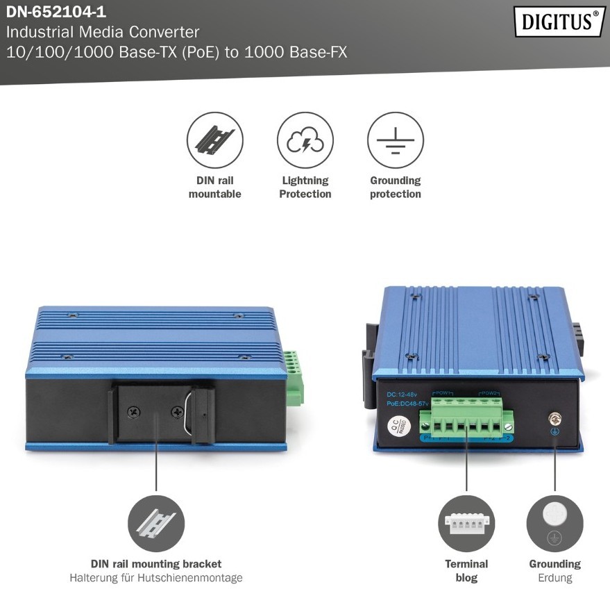 DIGITUS 10/100/1000Base-TX (PoE) to 1000Base-FX Industrial Media Converter