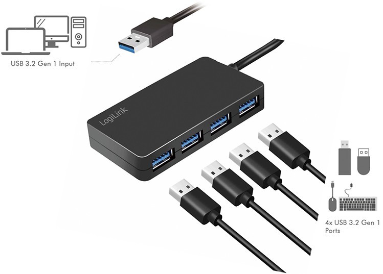Der Hub unterstützt den modernen USB 3.2 Gen1-Standard und ermöglicht Ihnen so den Anschluss von bis zu 4 USB-Geräten (4x USB 3.2 Gen1-Anschlüsse). Natürlich können Sie auch Geräte älterer USB-Generationen anschließen und nutzen. Einfacher Anschluss per Plug & Play. USB 3.2-Übertragungsraten von bis zu 5 Gbit/s.
