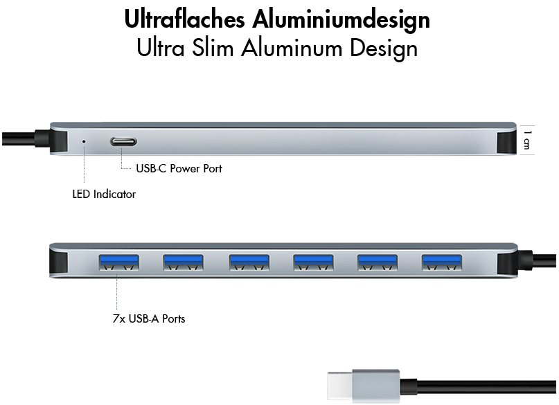 Dieser ultra-schlanke 7-Port USB-C Hub von LogiLink ermöglicht eine sofortige Erweiterung Ihres USB-C oder Thunderbolt 3/4 Laptops, Tablets oder Smartphones um sieben USB 3.0 Anschlüsse. Das hochwertige Aluminiumgehäuse ist mit nur 1 cm Bauhöhe besonders kompakt und ideal für den mobilen Einsatz geeignet. Mit Datenübertragungsraten von bis zu 5 Gbit/s und einem im Lieferumfang enthaltenen 20 W USB-C Netzteil bietet der Hub sowohl schnelle Konnektivität als auch eine zuverlässige Stromversorgung für Ihre Peripheriegeräte.